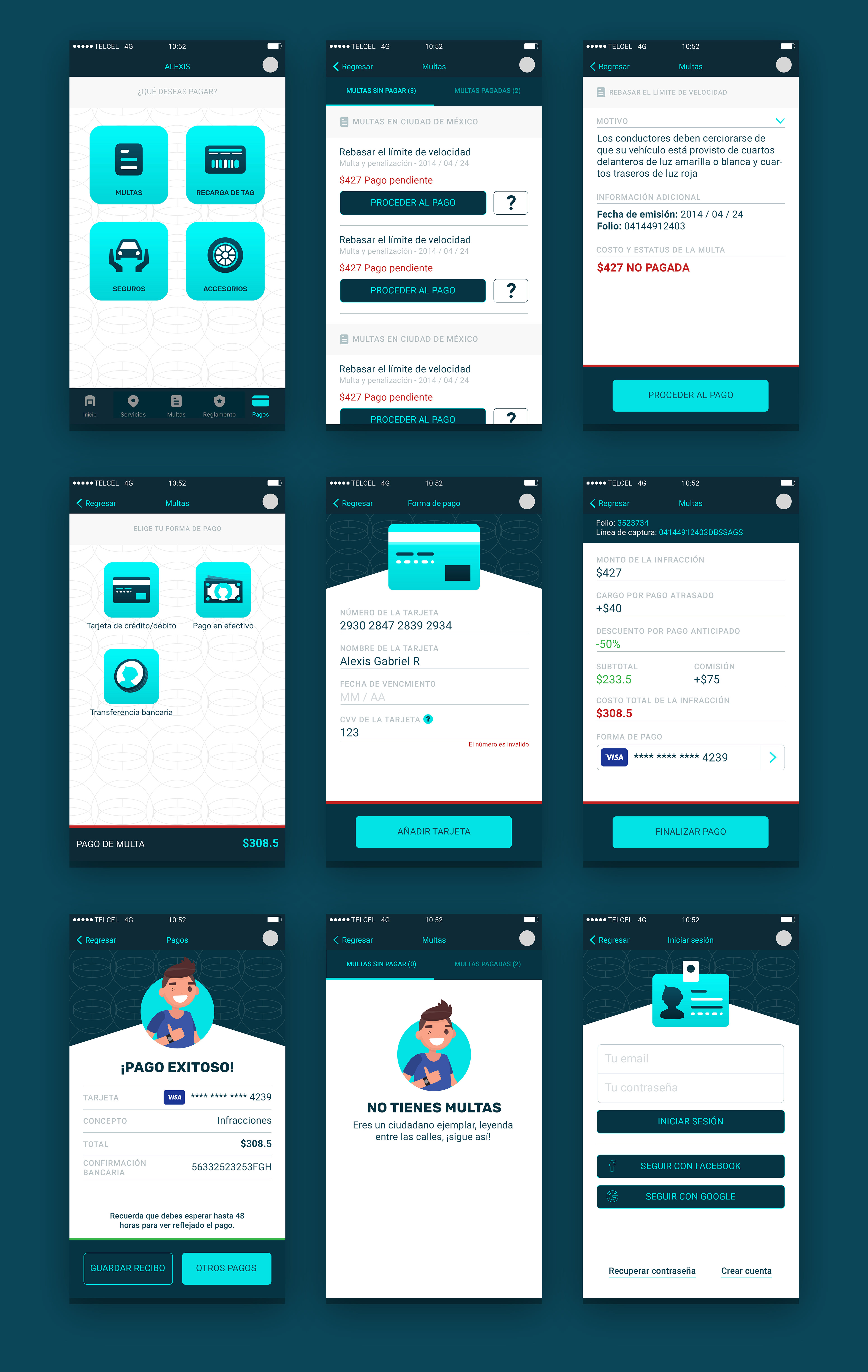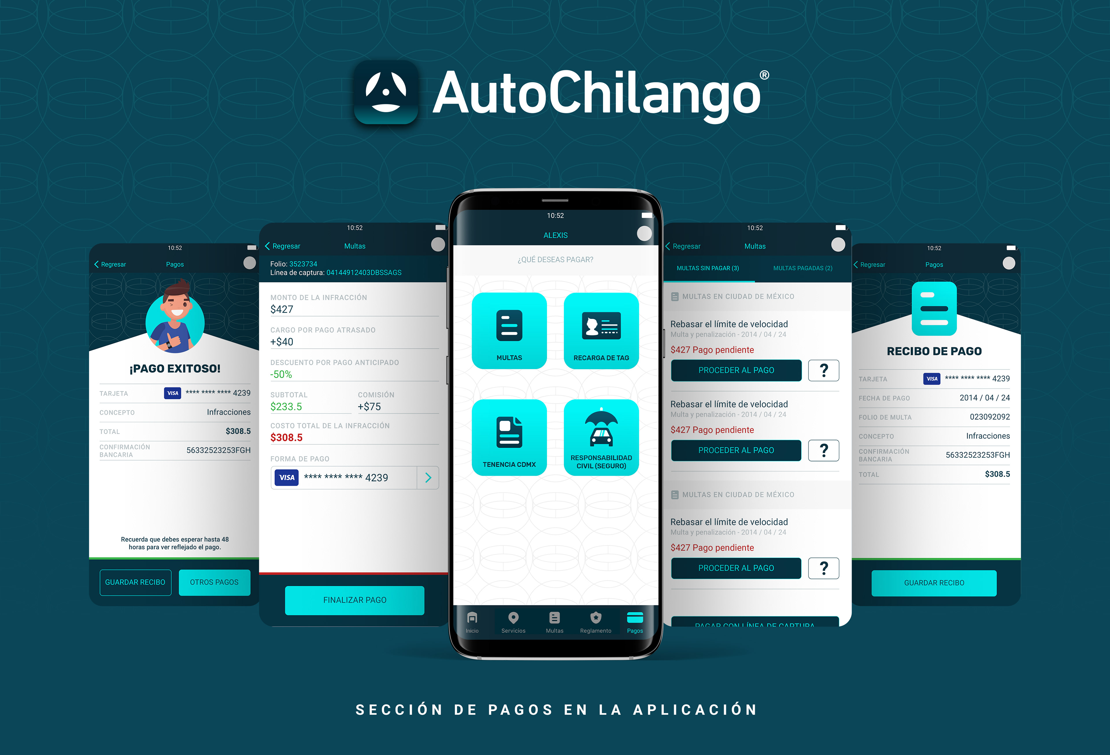 Diseño de la experiencia de usuario para la sección de pagos en Auto Chilango, app líder en el mercado en donde puedes pagar multas, seguro y recargar el tag de tu automóvil.